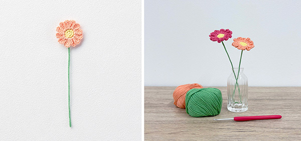 1つ作って一輪挿しに飾っても、たくさん編んで花束にしてもかわいい「ガーベラ」のワークショップです。