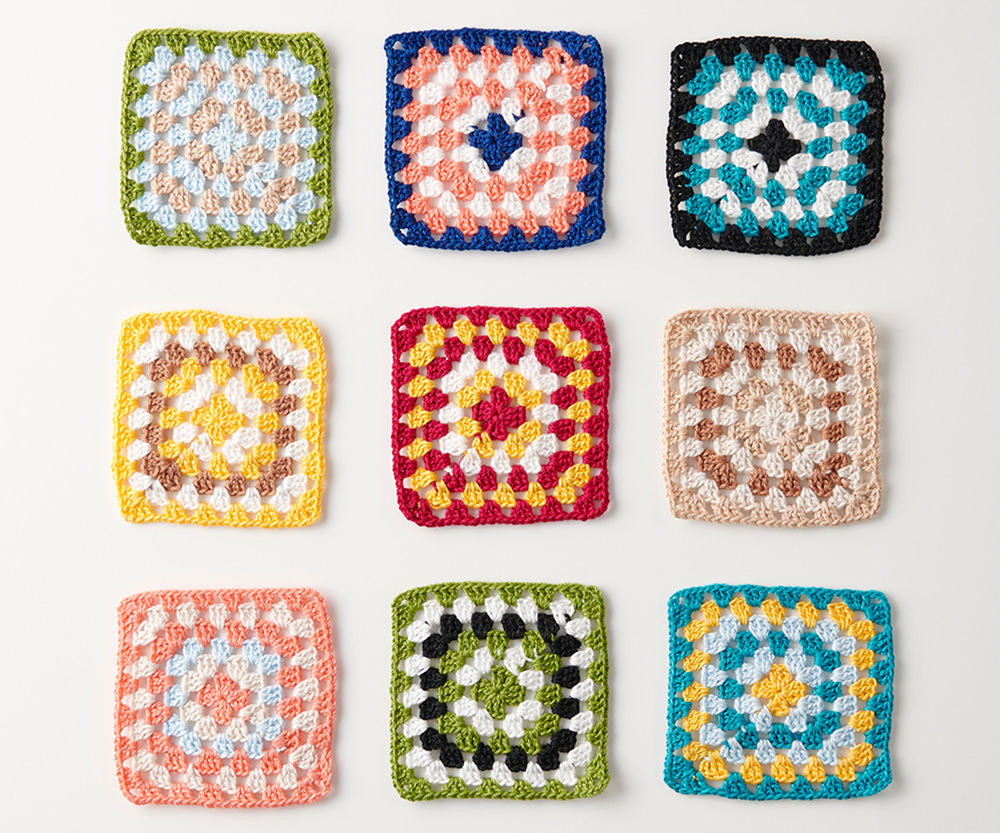グラニースクエアの魅力は、好きな色を選んで組み合せて無限のバリエーションが楽しめます。小さなサイズから始めることができるので、初心者さんも気軽に始められます。