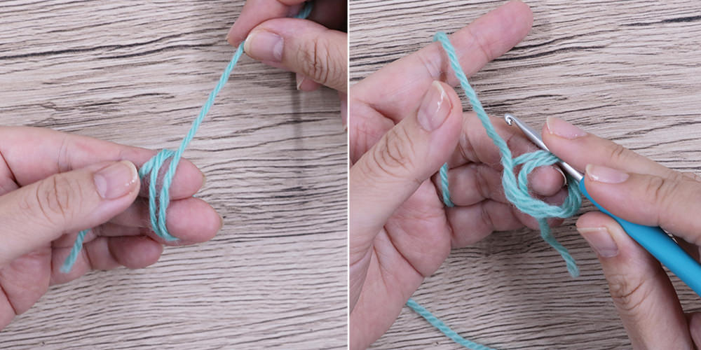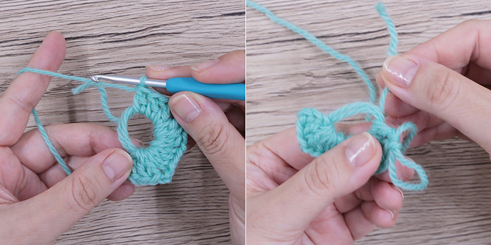 ◆わの作り目(穴が開かないタイプ)で編みはじめ、立ち上がりのくさりを3目編みます。