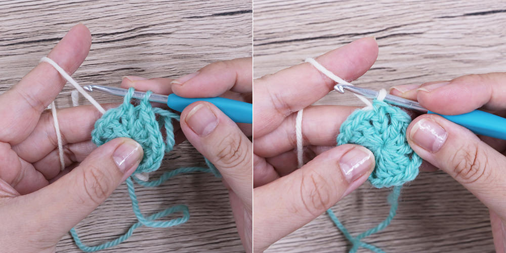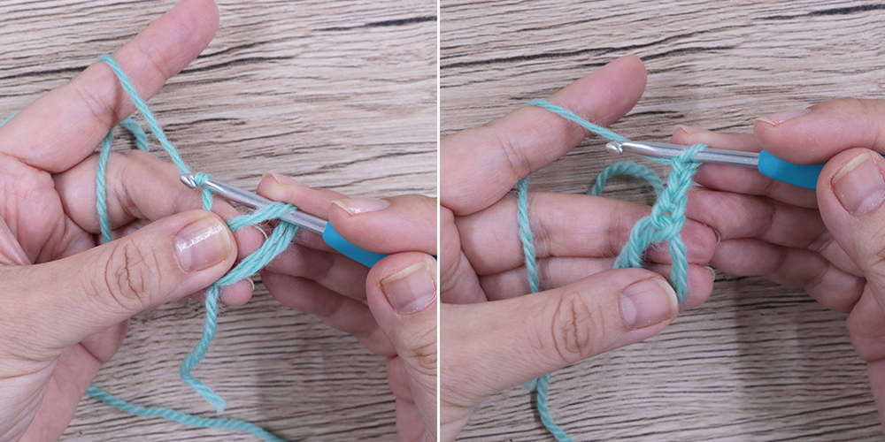 立ち上がりのくさり3目めに針を入れ、細編みを1目編みます。