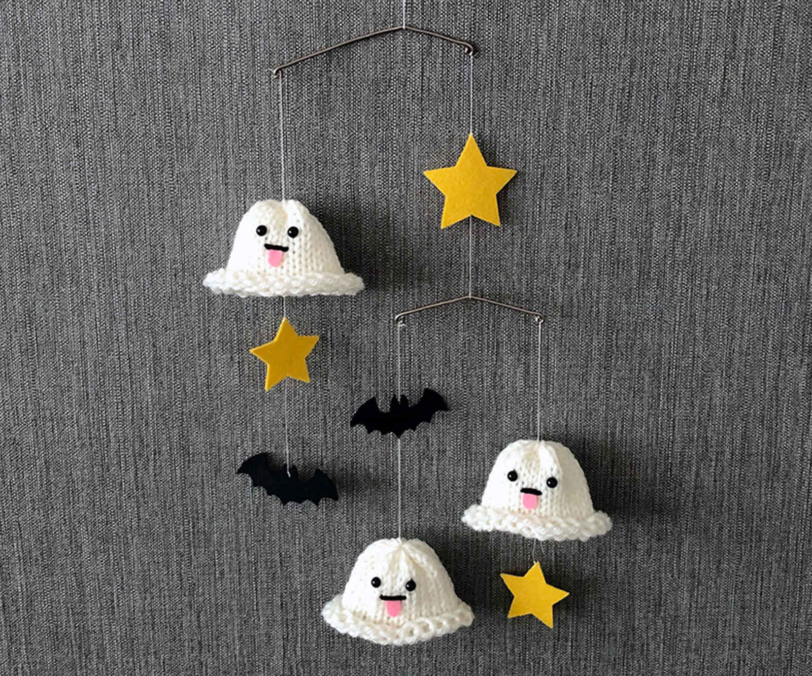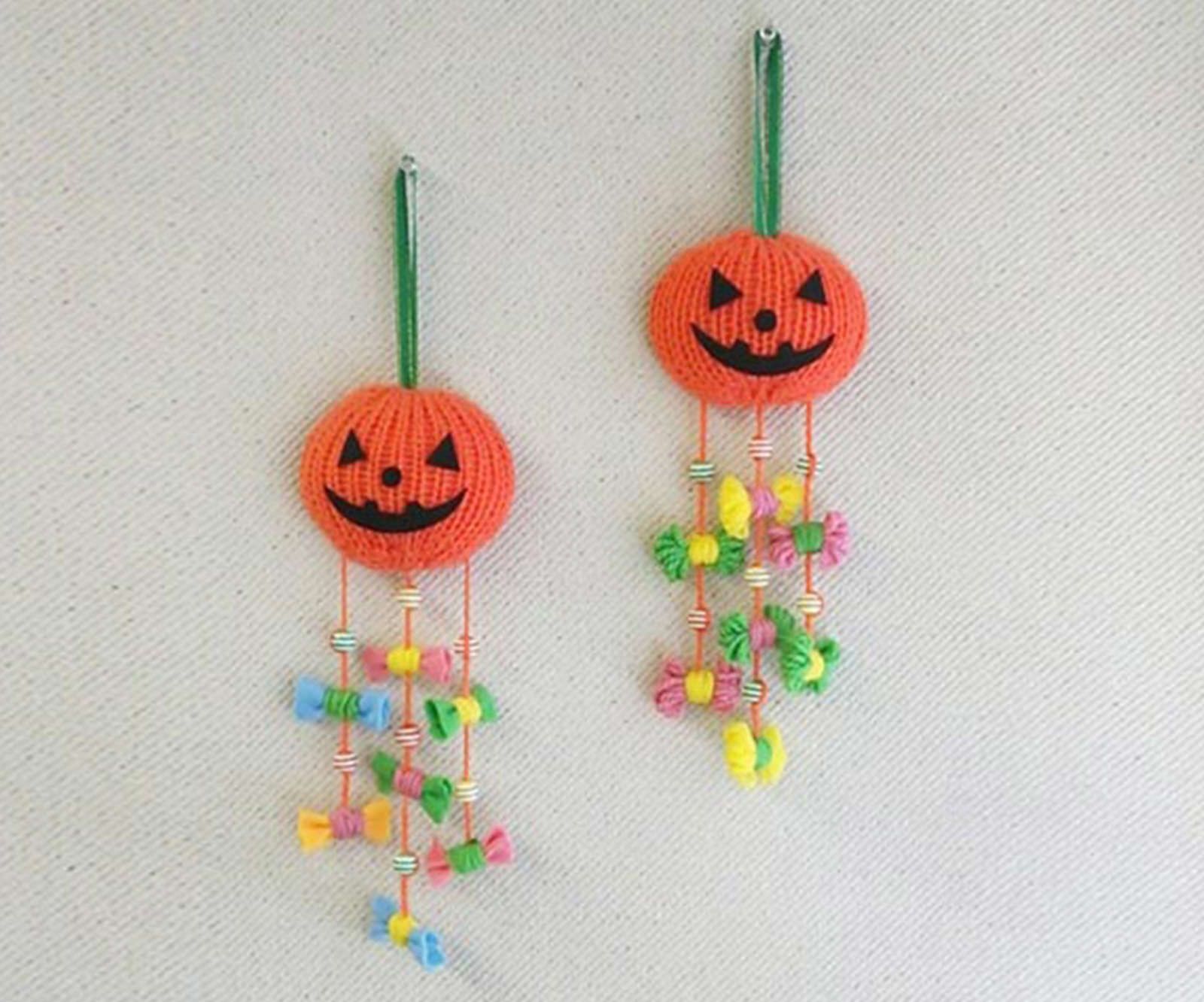 ゆらゆら揺れる飾りやモビールをお部屋に飾ると、ハロウィンの雰囲気をぐっと引き立ててくれます。こちらもオーバルニットルームで作れます。