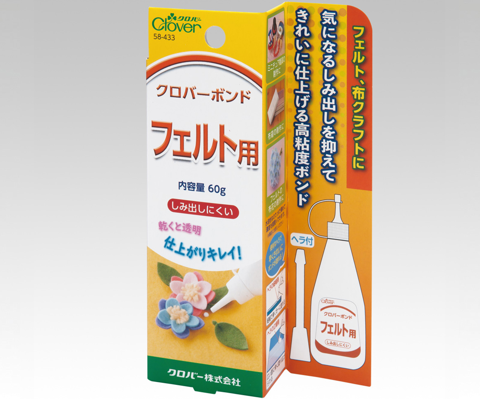 ボンドは用途によって使い分けると便利です。クロバーボンド〈フェルト用〉は、フェルトやウール地など、ボンドがしみ込みやすい素材を接着する高粘度のボンドです。