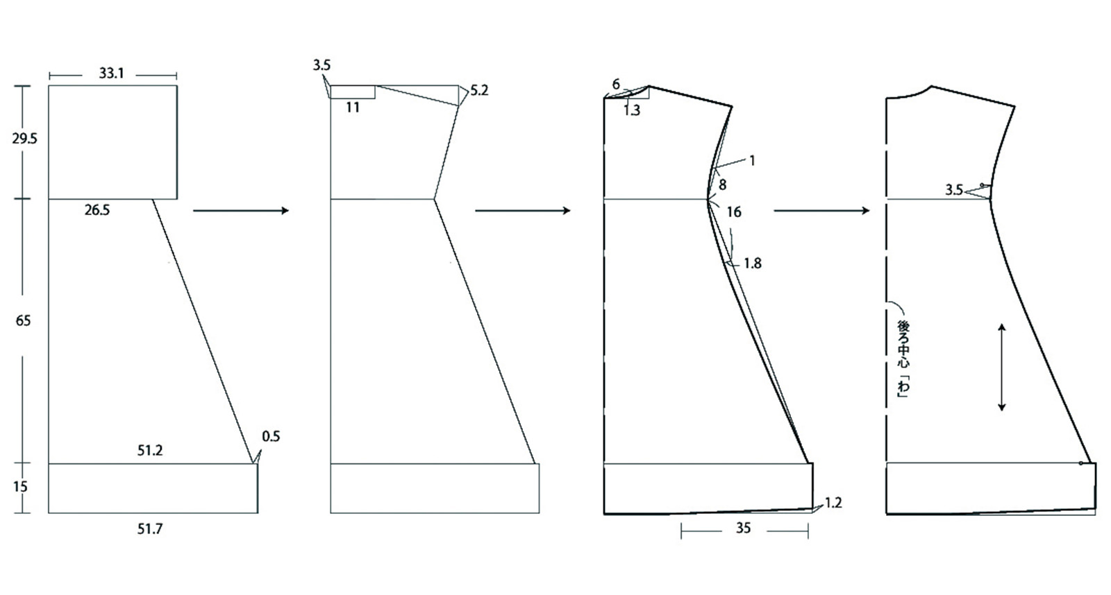 型紙作りの製図と裁断 → 縫い始める前の準備 → 縫い合わせる → アイロンをかけて裾などの処理する などになります。
