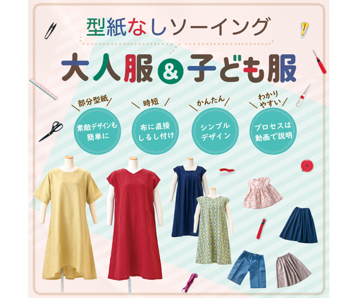 「型紙なしソーイング」は、布に直接しるしを付けて裁断、ぬいしろガイドやアイロン定規を駆使して、スピーディに完成させる簡単ソーイングです。