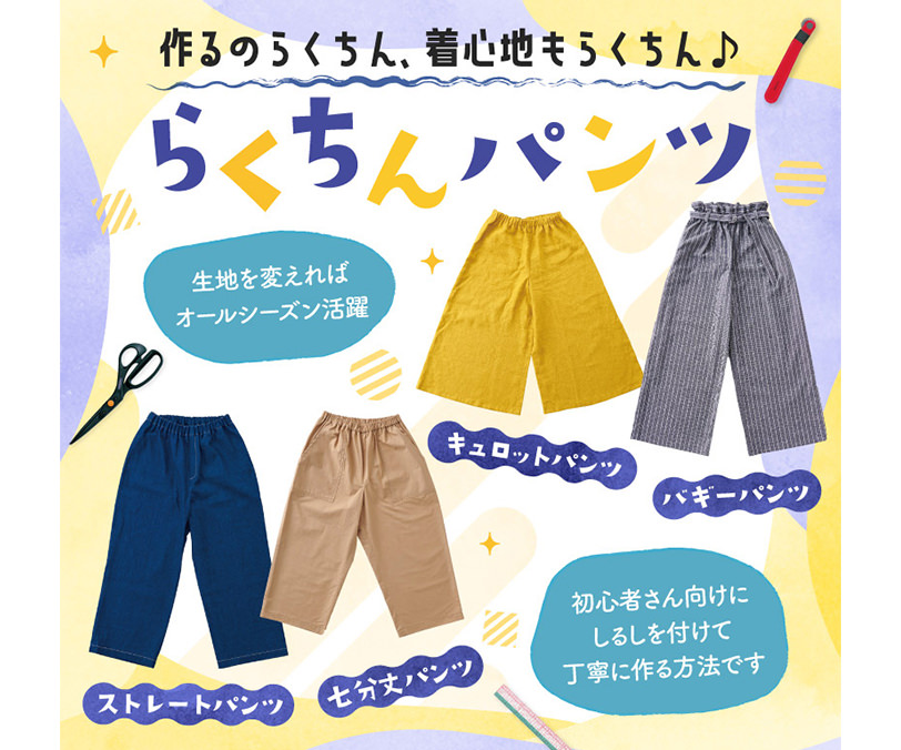 「らくちんパンツ」は、ストレートパンツ・七分丈パンツ・キュロットパンツ・バギーパンツのレシピがあります。