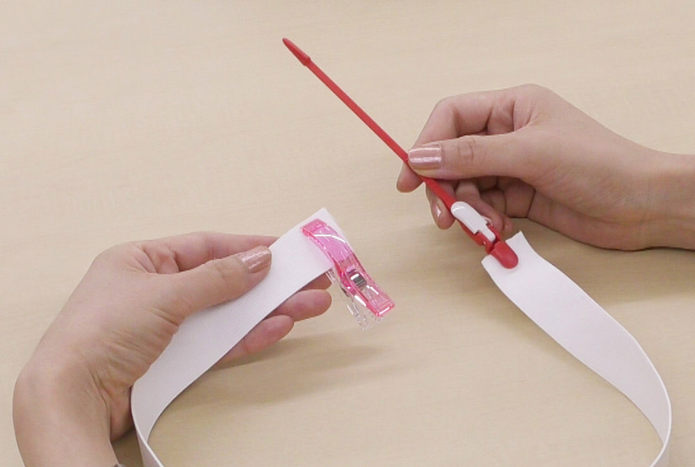 最後は、ウエストにゴムを通して、ゴム通し口を閉じたらスカートの完成。アイロン定規やゴム通し、仮止めクリップ<ロング>などの便利な道具を使えば、初心者さんもきれいに仕上がります。