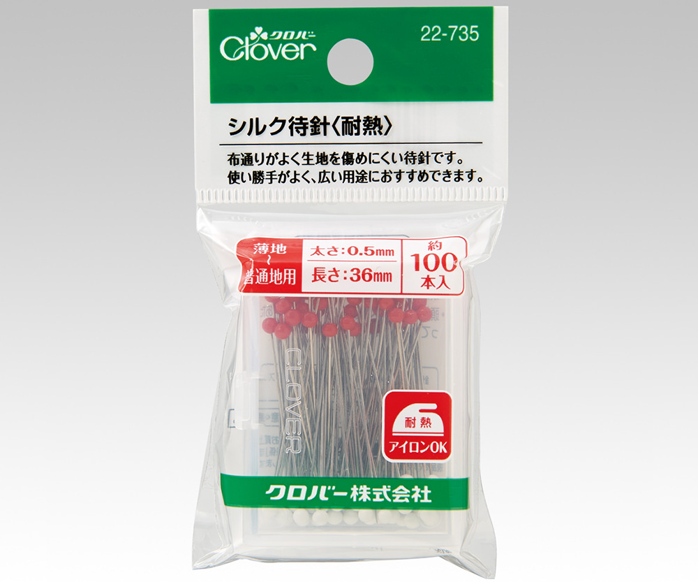 太さ0.5mmの細い針軸と耐熱ガラスの頭で使いやすい待針です。布につけたままアイロンOKです。