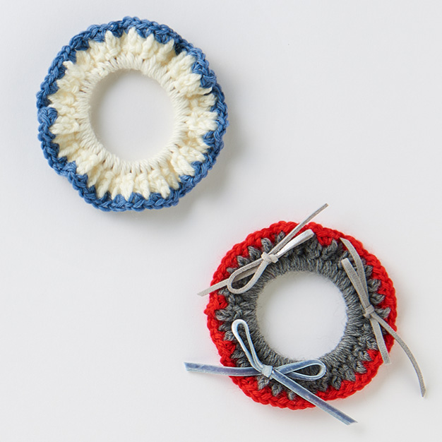 くさり編み、長編み、引き抜き編みなど、最初に覚える基本の技法で作品が完成。「わの作り目」の練習にも。