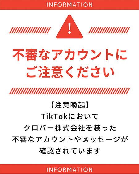 現在、TikTok上において、クロバー株式会社(以下「当社」)を装い商品紹介案件やクリエイター募集の連絡を行うアカウントの存在が確認されております。