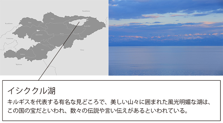 キルギスは、中央アジアに位置する国土全体の約40%が標高3000mを超える山国で、雄大な天山山脈、琵琶湖の9倍の面積を誇るイシククル湖、広大な森や牧草地に咲き乱れる花々など、美しい自然が特徴の国です。古くから羊や牛などの家畜を放牧させて育てる遊牧業が生活のスタイルで、ユルタと呼ばれる移動式住居やカーペットなどに羊毛を利用してきました。