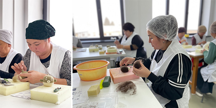 JICAはこのような問題を解決するべく、日本が発祥の一村一品運動を進めるための現地法人OVOP+1 [OVOP=One Village One Productの略(ひとつの村にひとつの特産を、の意味)]を立ち上げ、その活動をサポートしています。OVOP+1の活動内容は、キルギスの原材料を使った商品開発から生産指導・販売までを手掛け、地域の活性化を目指しています。その一環として行われているのが羊毛フェルト商品の生産です。
