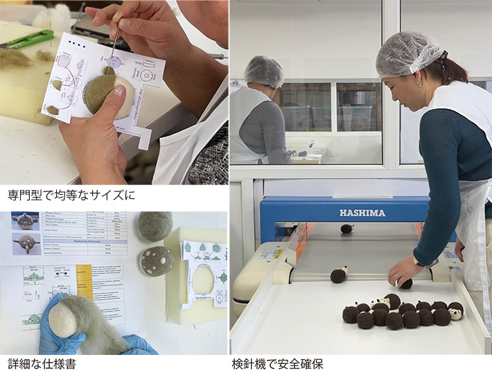 羊毛フェルト人形は手作り品のため、作る人によって形にバラツキが出やすく、また一人あたり一日に2~3個程度しか作れず、かなりの時間を要します。