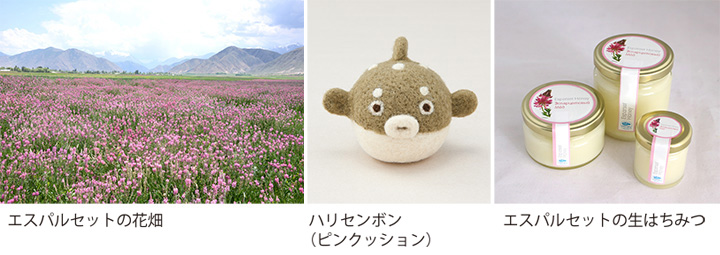 羊毛は品質の良いメリノウールのみを使用し、染色は地域の身近な植物を使った草木染めです。ハリセンボンの羊毛の染色には、高山植物のマメ科の植物 “エスパルセット” が使われています。エスパルセットは草木染めの他、はちみつの蜜源としても使われます。