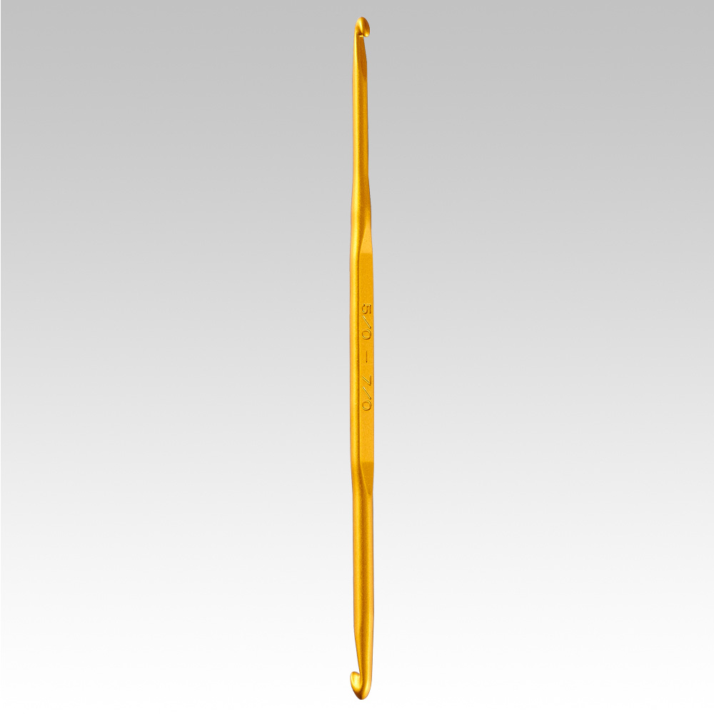 表面にアルマイト加工を施しています。両端に異なった号数の付いたかぎ針です。並太毛糸に。