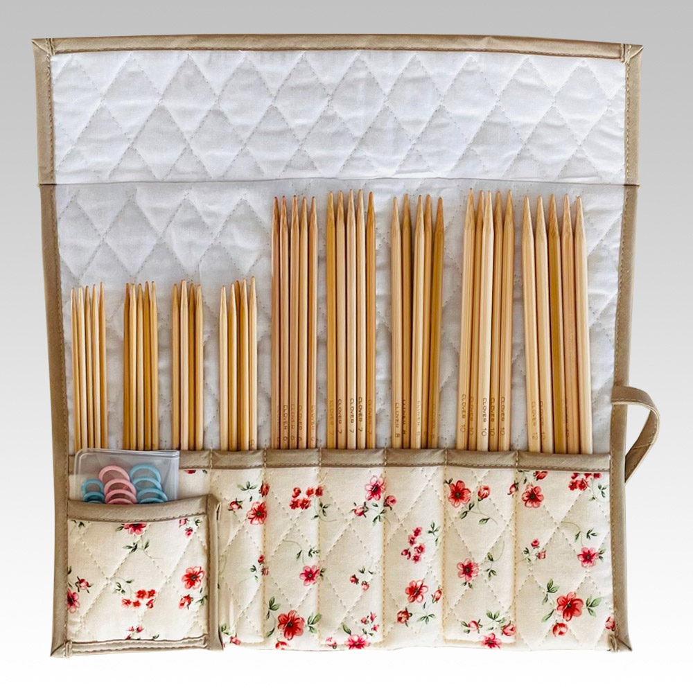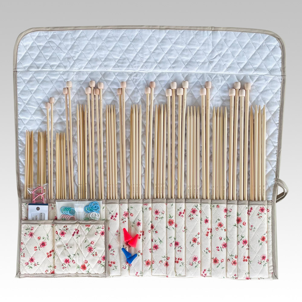内容物:「匠」2本針(3・4・5・6・7・8・10・12・13・15号)/4本針(6・8・10・12号)/5本針(2・4号)/カラーほつれ止2本/なわあみ針/棒針キャップ(S)/目数リング/段数リング/とじ針(No.15・18)/キルティングケース入