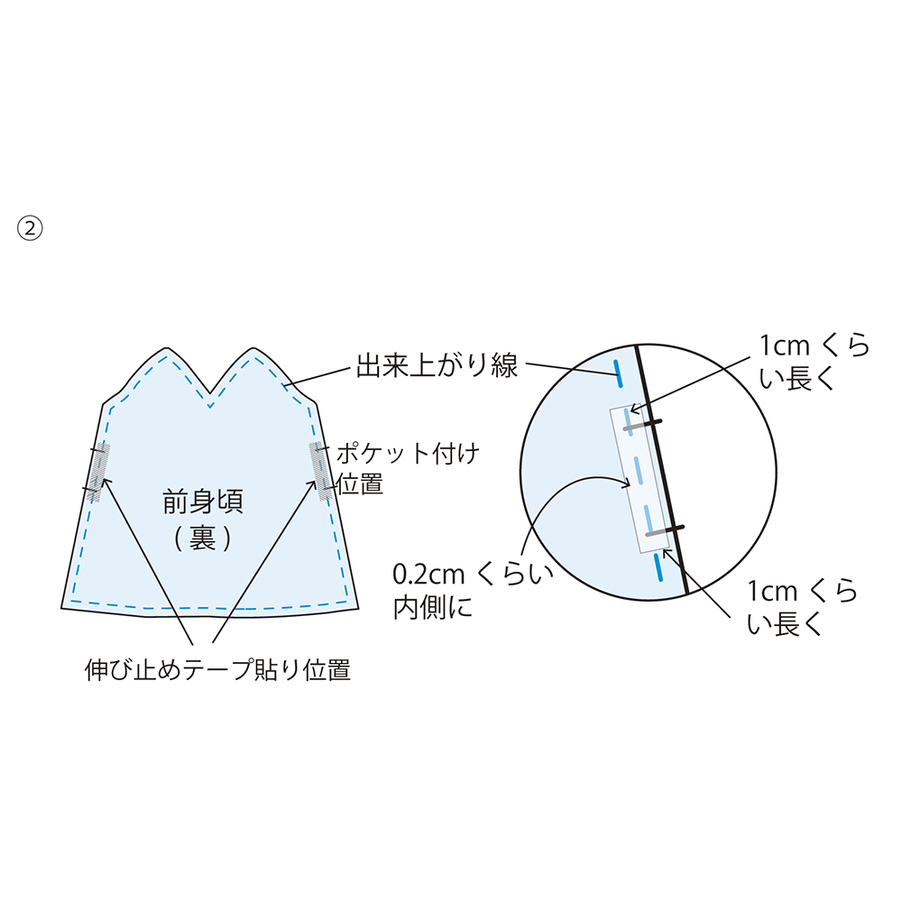前身頃のポケット口に伸び止めテープを貼ります。アイロンで接着する時は、上からプレスするようにします。