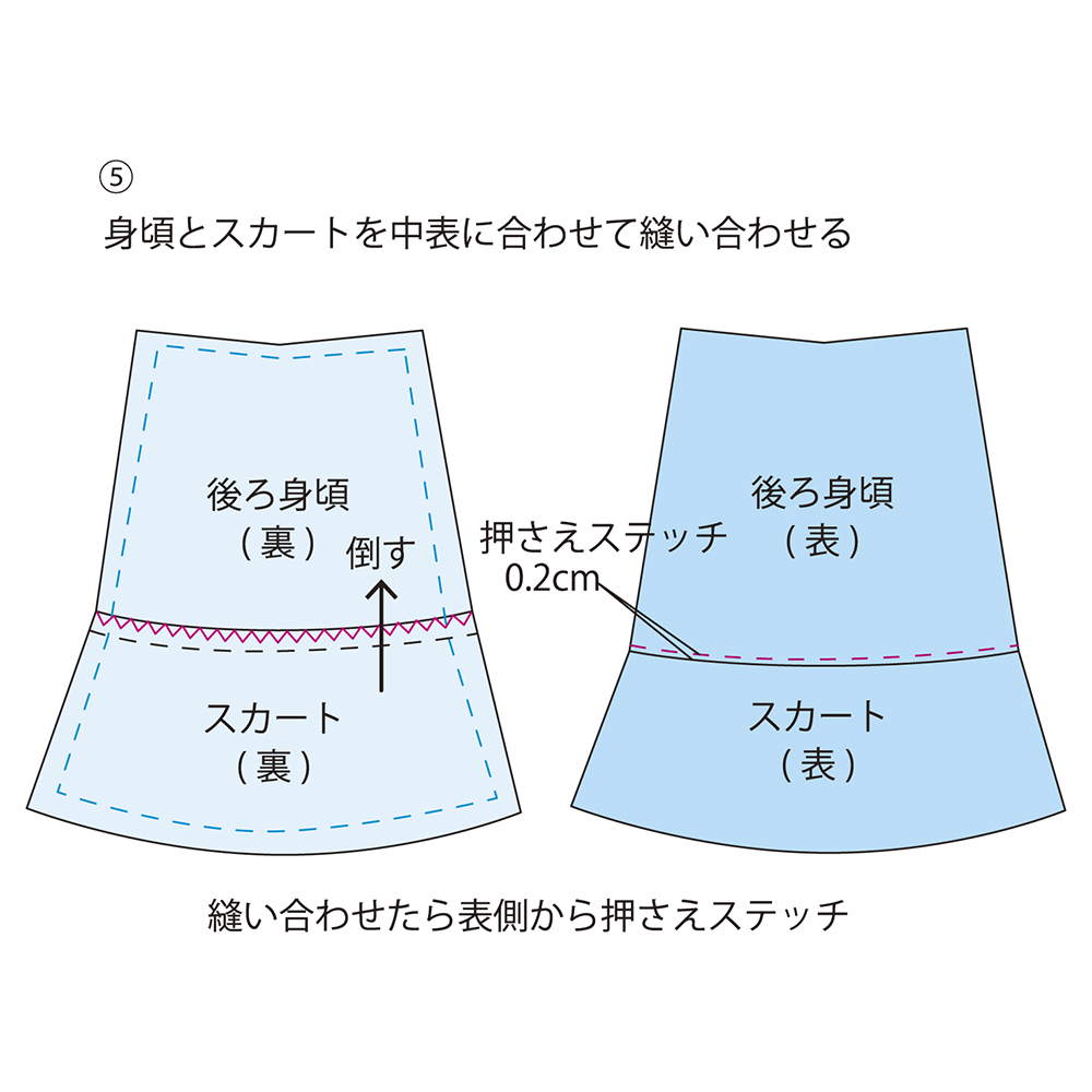 身頃とスカートを中表に合わせて待針でとめ、縫い合わせます。ぬいしろは2枚一緒にジグザグミシンをかけ、身頃側に倒します。アイロンで整えた後、表側からステッチをかけます。