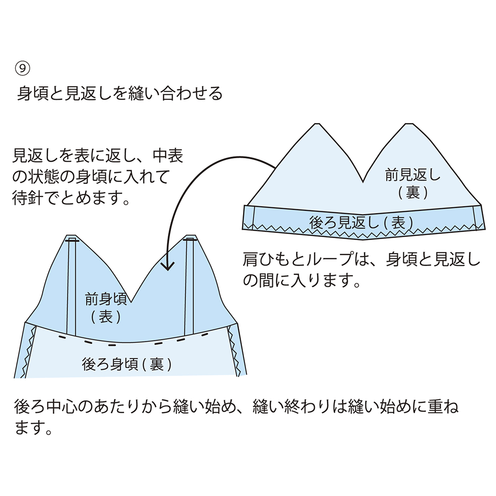 前後見返しを縫い合わせ、ウエスト側にジグザグミシンをかけた後、身頃と中表に合わせて縫い合わせます。ぬいしろを半分にカットし、Vのところと脇の縫い目付近にのぬいしろに切り込みを入れ、表に返してアイロンで整えたら、表側からステッチします。
