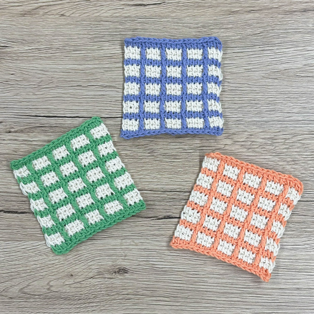 - アフガン編みで編む、チェック柄が可愛いコースターです。