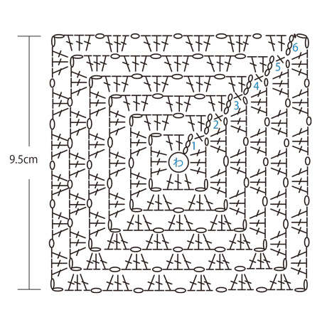 モチーフを編みます。わの作り目で編みはじめて、1段ごとに色を変えて編みます。図と配色表をご参照ください。