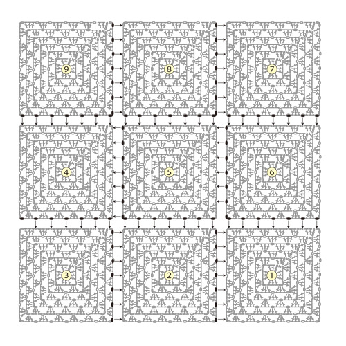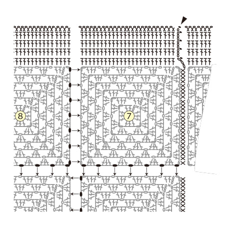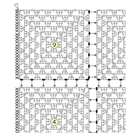 2枚目からは、前に編んだモチーフと引き抜き編みでつなぎながら図の数字の順に編みます。9枚つなぎます。これを2枚編みます。