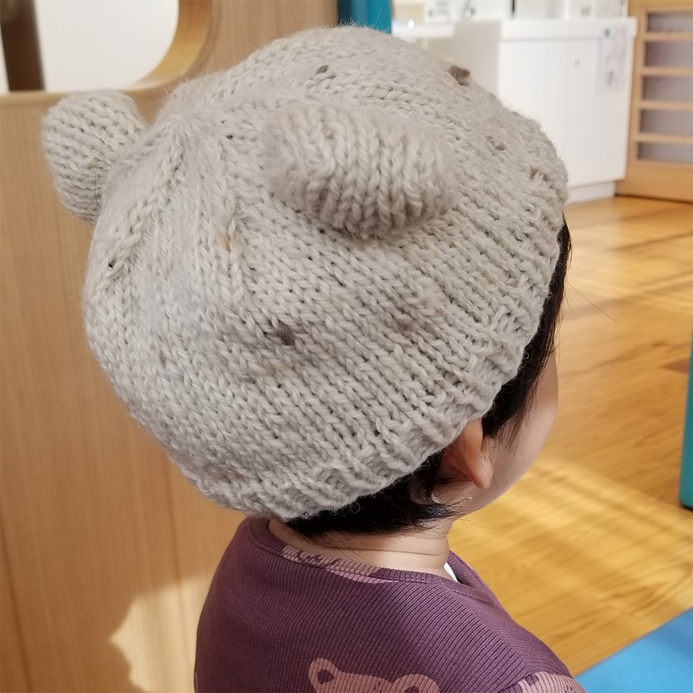 - かわいい耳が付いた、人気の「くま耳帽」を編んでみませんか。2~3歳サイズです。