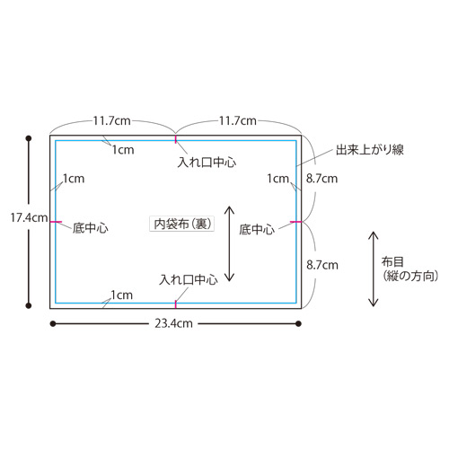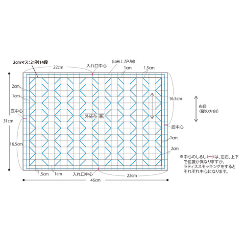 外袋布を図の通りに裁断し、裏面に直接格子の線、斜線、しるしを描きます。