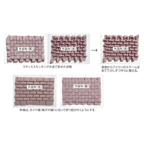 別紙の「ラティススモッキング 「BRICK/レンガ柄」 刺し方」を参考に、外袋布にラティススモッキングをします。ラティススモッキングができた外袋布をアイロンで整えます。