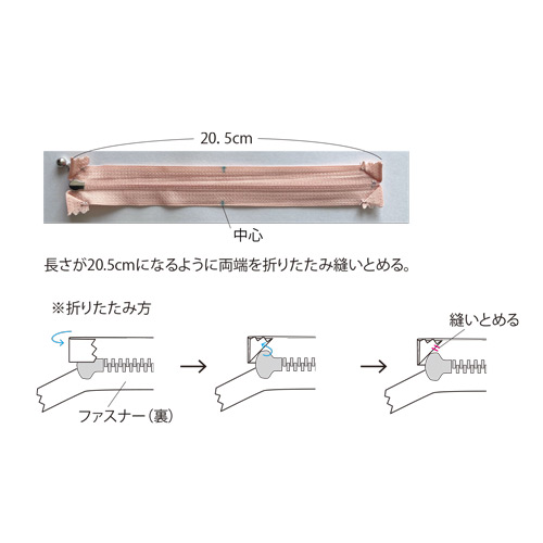 ファスナーの準備をします。ファスナーの端を折りたたんで縫いとめ、中心にしるしを付けます。