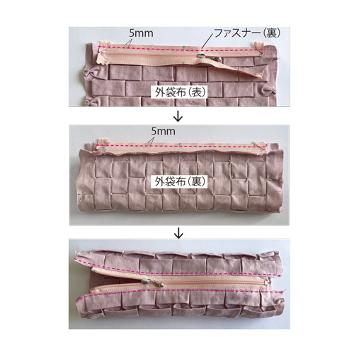 中心のしるしを合わせ、外袋布とファスナーを中表に重ね、ぬいしろ0.5cmで縫います。縫い始めと縫い終わりは返し縫いをします。外袋布を中表に半分に折り、反対側も同様にファスナーと縫い合わせます。表に返し、ぬいしろを本体側に倒します。倒したぬいしろをおさえるように、表側からファスナーの端にステッチします。