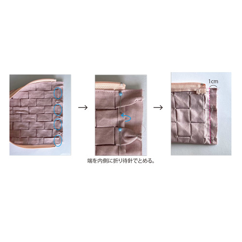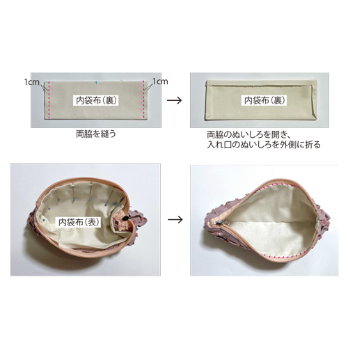 底中心のしるしで中表に半分に折り、両脇をぬいしろ1cmで縫います。ぬいしろは割っておきます。入れ口のぬいしろも1cm外側に折ります。本体(外袋)の中に内袋を入れ、入れ口中心のしるしで合わせて待針でとめます。ファスナーの縫い目の上でぐるりと一周まつり縫いして完成です。