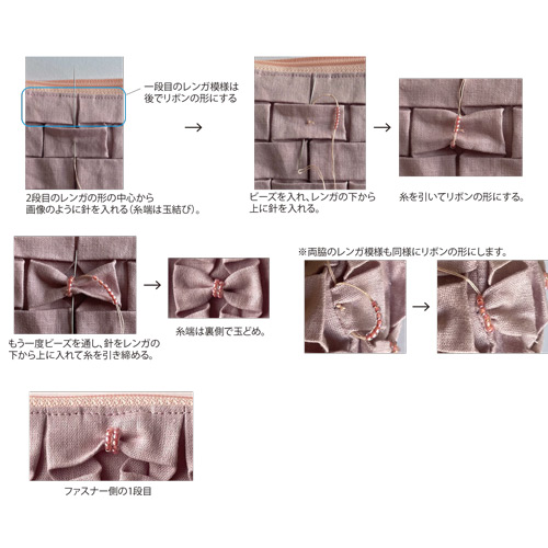 本体を表に返し、リボンの形を作っていきます。)ファスナー側から2段目以降のレンガ模様をリボンの形にしていきます。レンガの中心から針を入れ、丸小ビーズを7粒通します。針を出した反対側から針を入れ、糸を引き締めてリボンの形にします。)もう一度ビーズを7粒通して、針をレンガの下から上に入れ、糸を引き締めます。最後は裏側で玉どめします。 他のレンガ模様も同様にリボンの形にします。ファスナー側の1段目は、2段目以降と同じ要領でレンガの1/3辺りに針を刺して2/3辺りから出し、ビーズを5粒通してリボンの形にします。