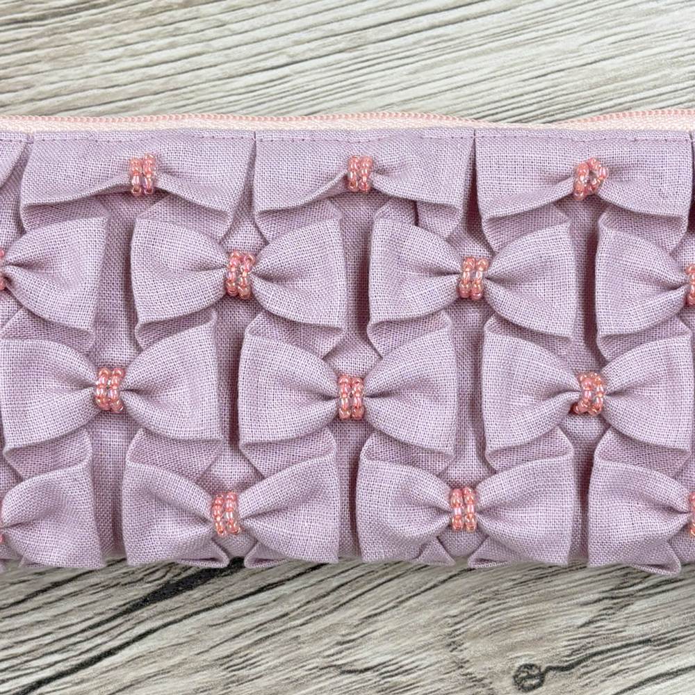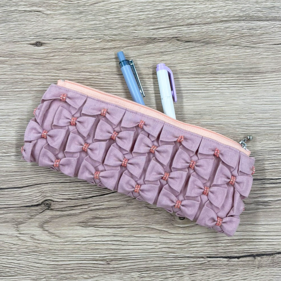 布を裏から格子状に縫い縮めて表に立体的な柄を出す「ラティススモッキング」の技法を使って作るペンケースです。
