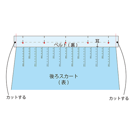 ベルト布とスカートを待針でとめます。 ベルト布は長めに設定してあるので、左右の端からはみ出した分はカットします。
