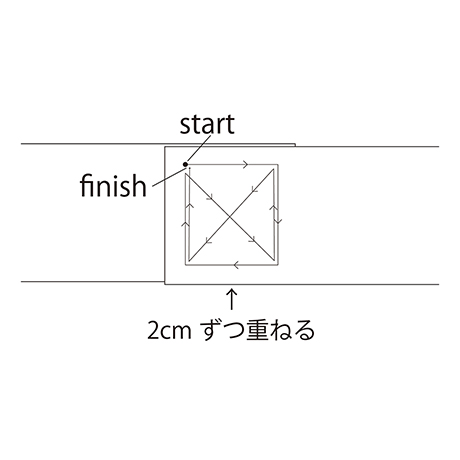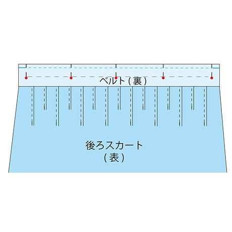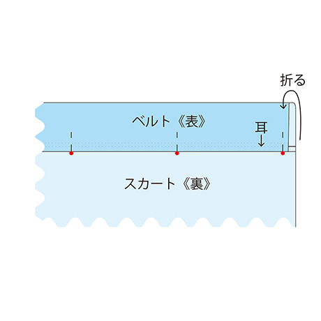 ゴムを通して、ゴム端を図のように縫い合わせます。 ゴムの長さは「ウエストサイズ×0.9+2cm」で計算します。 ・ベルトとスカートを縫い合わせた線に重ねるように、表側から縫います。