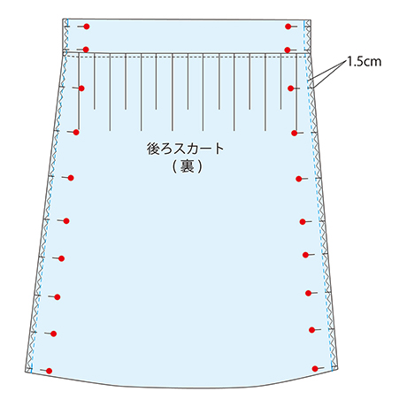 前後スカートを中表に合わせて待針でとめ、端から1.5cmのところを縫います。 縫い始めと縫い終わりは返し縫いをします。 縫い合わせたら、ぬいしろは割っておきます。