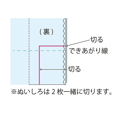型紙作り、裁断までの準備は「型紙の作り方」と「裁断の方法」PDFをご覧ください。 裁断するときは、生地とはさみは持ち上げずに切ってください。
