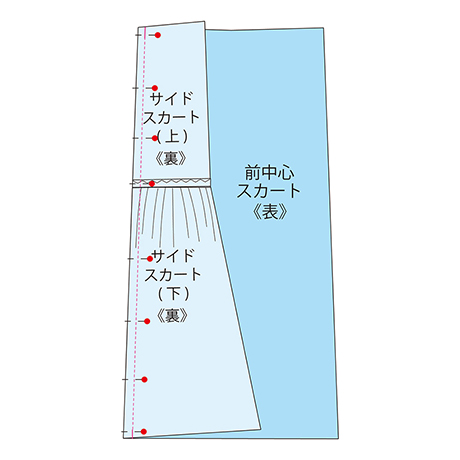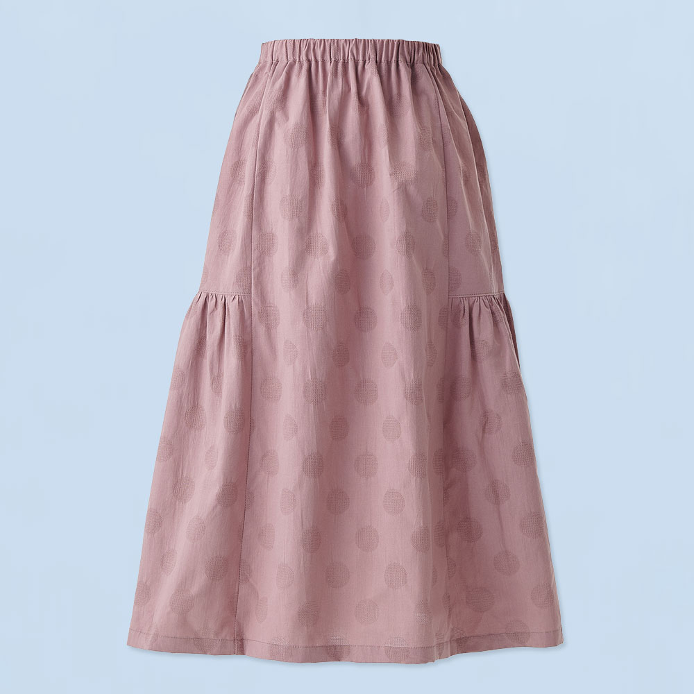 前スカートと後ろスカートの中心はすっきりさせ、両脇にギャザーをあしらった華やかで甘すぎないデザインのスカートです。
