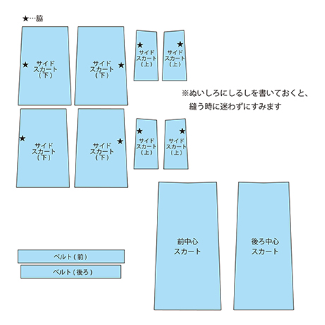前スカートと後ろスカートのパーツを作って脇で縫うだけで、素敵なスカートが作れます。