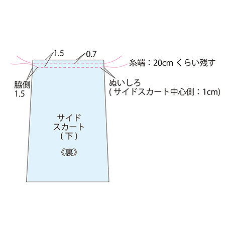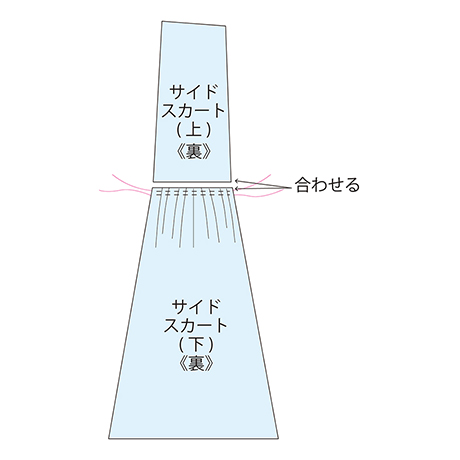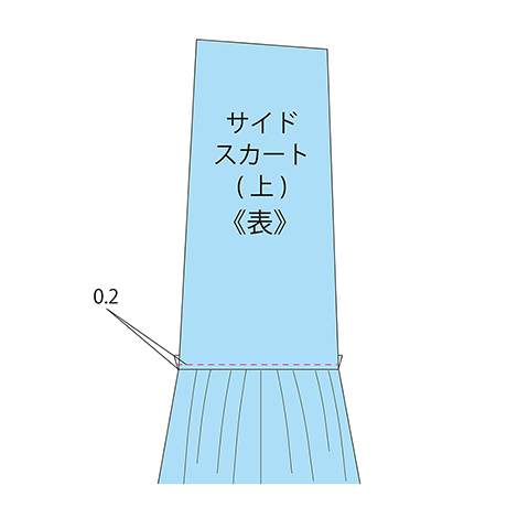 サイドギャザースカート(下)にギャザーを寄せます。 ギャザーを寄せるための粗ミシンをかけます。