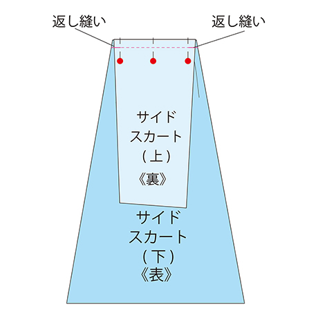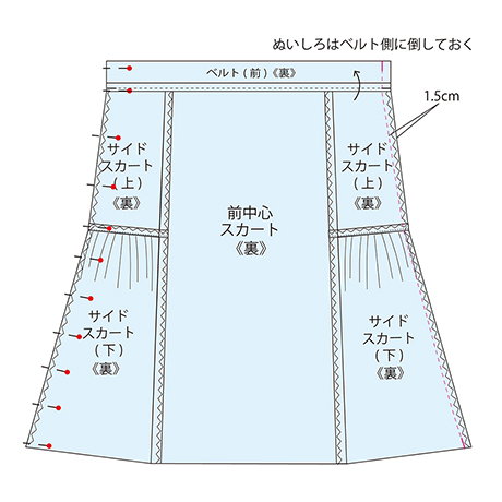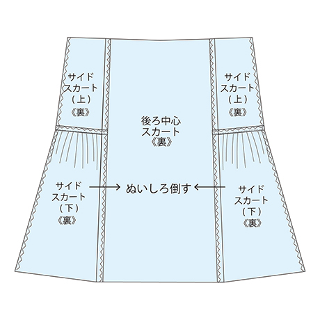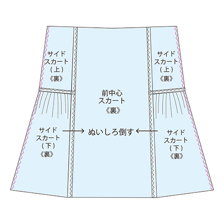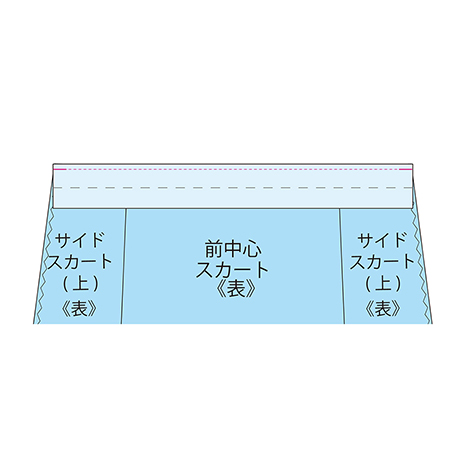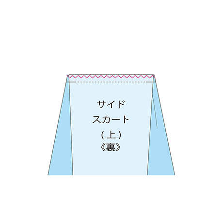 図のところを表側から抑えステッチします。 ★サイドスカートパーツは左右1組×前後スカート用で、合計4枚になります。