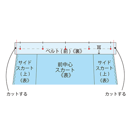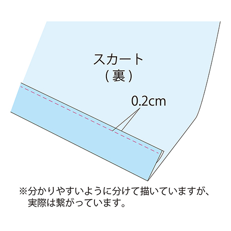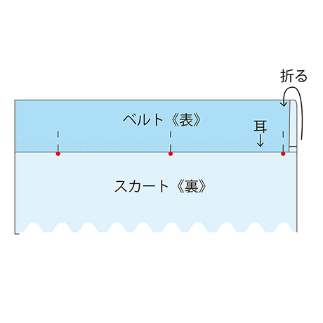 ゴムを通して、ゴム端を図のように縫い合わせます。 ゴムの長さは「ウエストサイズ×0.9+2cm」で計算します。 ・ベルトとスカートを縫い合わせた線に重ねるように、表側から縫います。