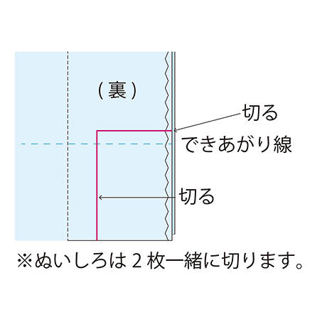 型紙作り、裁断までの準備は「型紙の作り方」と「裁断の方法」PDFをご覧ください。 裁断するときは、生地とはさみは持ち上げずに切ってください。