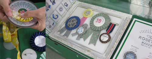 ロゼットメーカー、リボンでなくテープメーカーに通した布でも作れます。