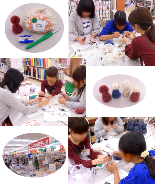 ミニキャップチャームやリボンヘアゴムなど、かぎ針を使った簡単なワークショップは、