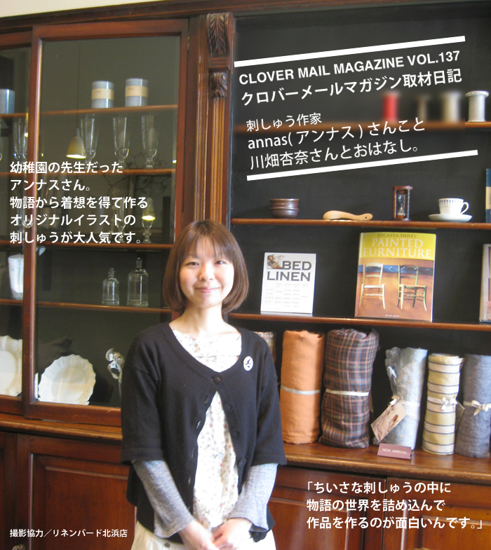 クロバーメールマガジンの取材で、最近注目の刺しゅう作家・川畑杏奈さんにお目にかかりました。