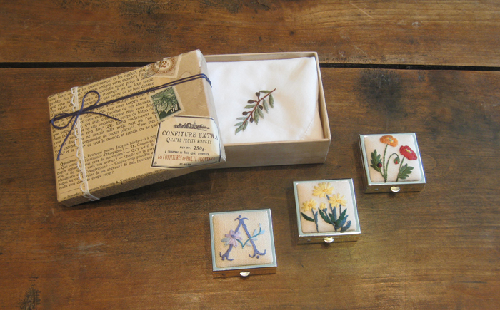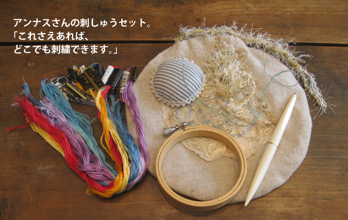 お友達が作られたという素敵な布製のポーチに最小限の刺しゅう用具を入れて出張にでられます。針やしるし付け用品は、クロバーのものを使ってくださっているそうです♪