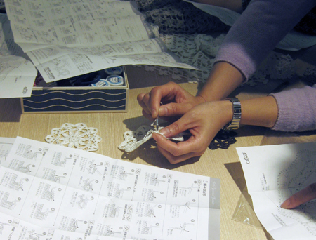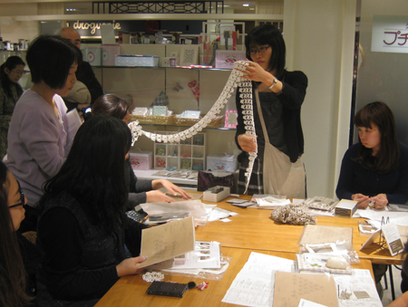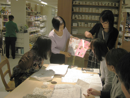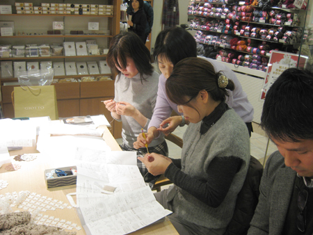 クロバーの人気手芸シリーズ「ちいさなてしごと」の世界を味わっていただこうと、池袋西武7階(南B9) 趣味の店 サンイデー様で講習会を開催しました。発売されて間もない「レースクロッシェのドイリー」のキットを、作者であり、「ちいさなてしごと クロッシェキット」を立ち上げ期からすべて担当していただいている横山かよ美先生に教えていただく、という趣向です。