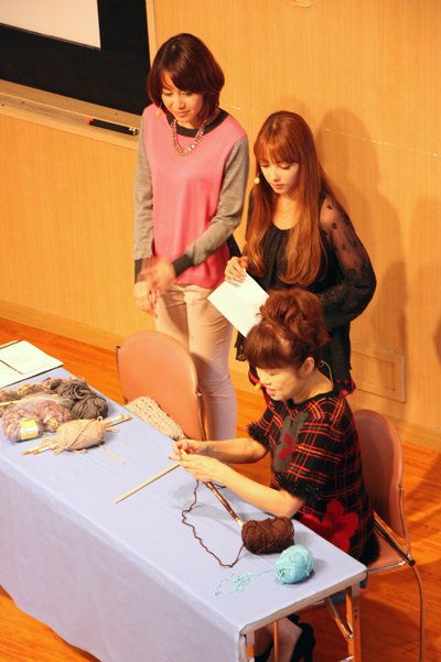編み方説明中です。司会のお二人もニット帽を編まれていましたよ。