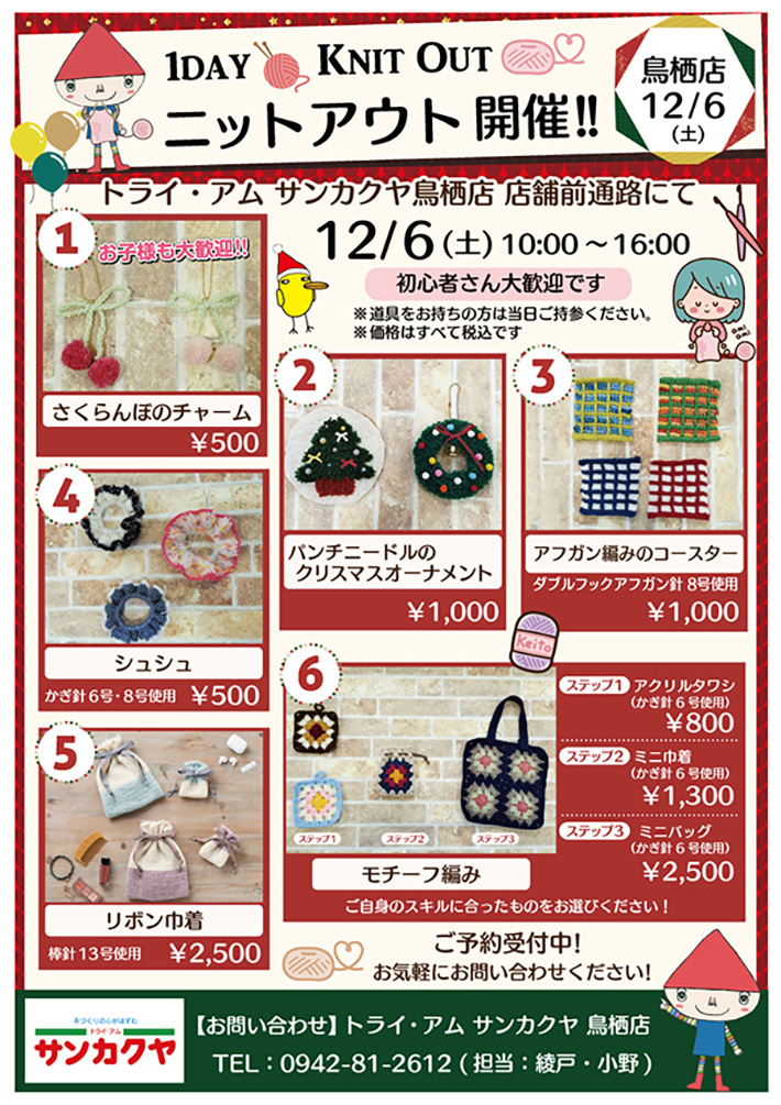 2025年12月6日(土)にトライ・アム サンカクヤ鳥栖店で、「1Day KNIT OUT」が開催されます。